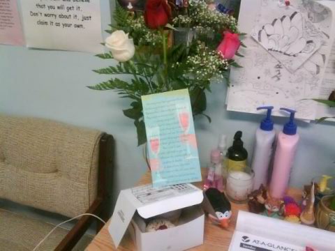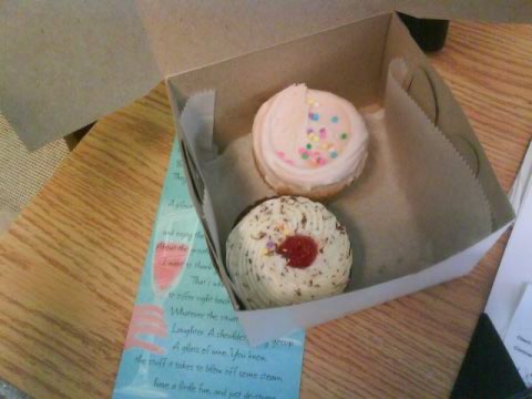 さてさて、ぶりかえした風邪がピークをたっして結構しんどかった先週の火曜日、仕事に行くとデスクの上に花束とカップケーキとカードが。。。